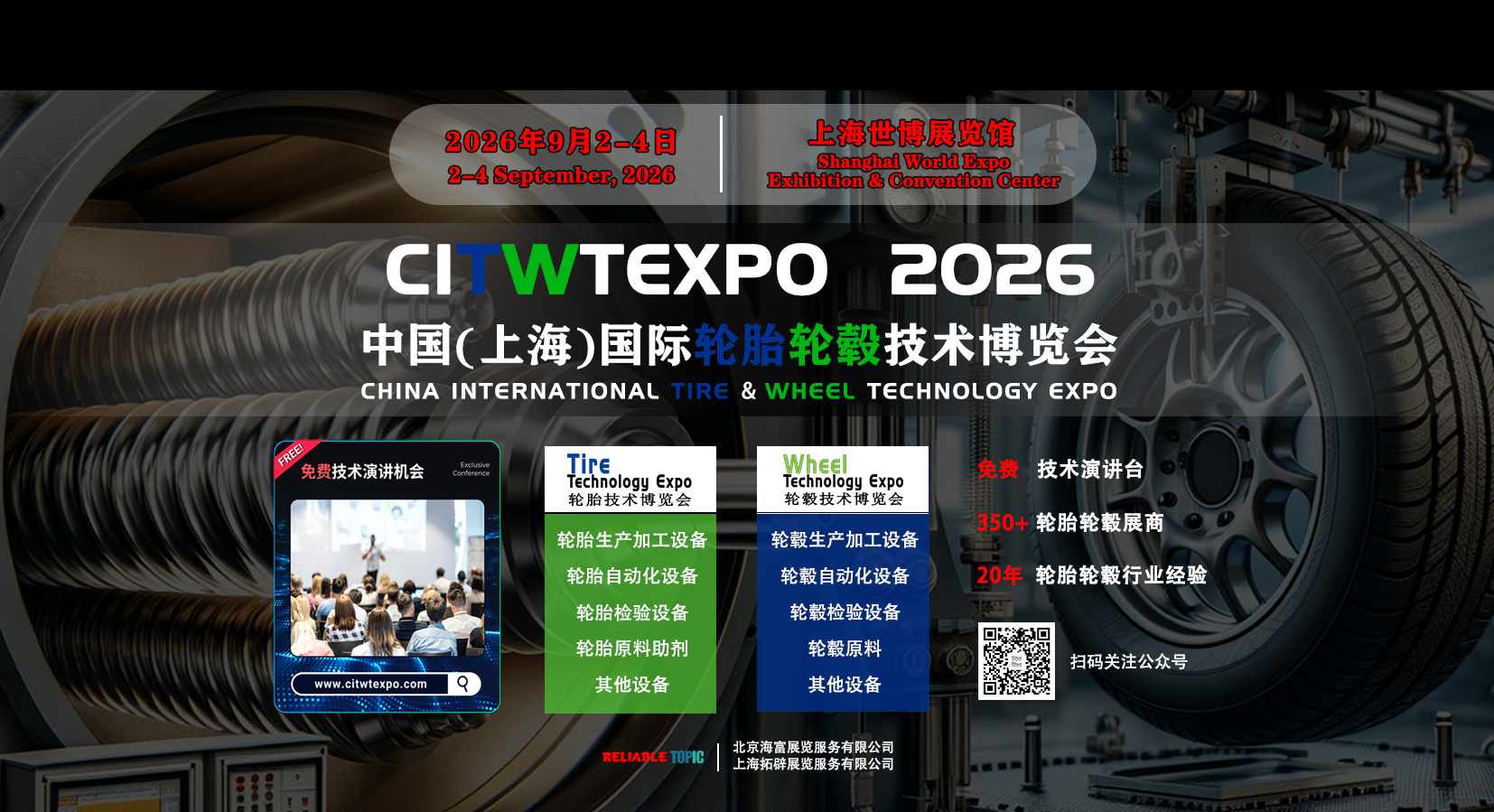 中國國際輪胎輪轂技術博覽會CITWTEXPO由海富展覽服務有限公司、上海拓辟展覽服務有限公司和著名的中國國際輪胎輪轂博覽會同期聯合舉辦。